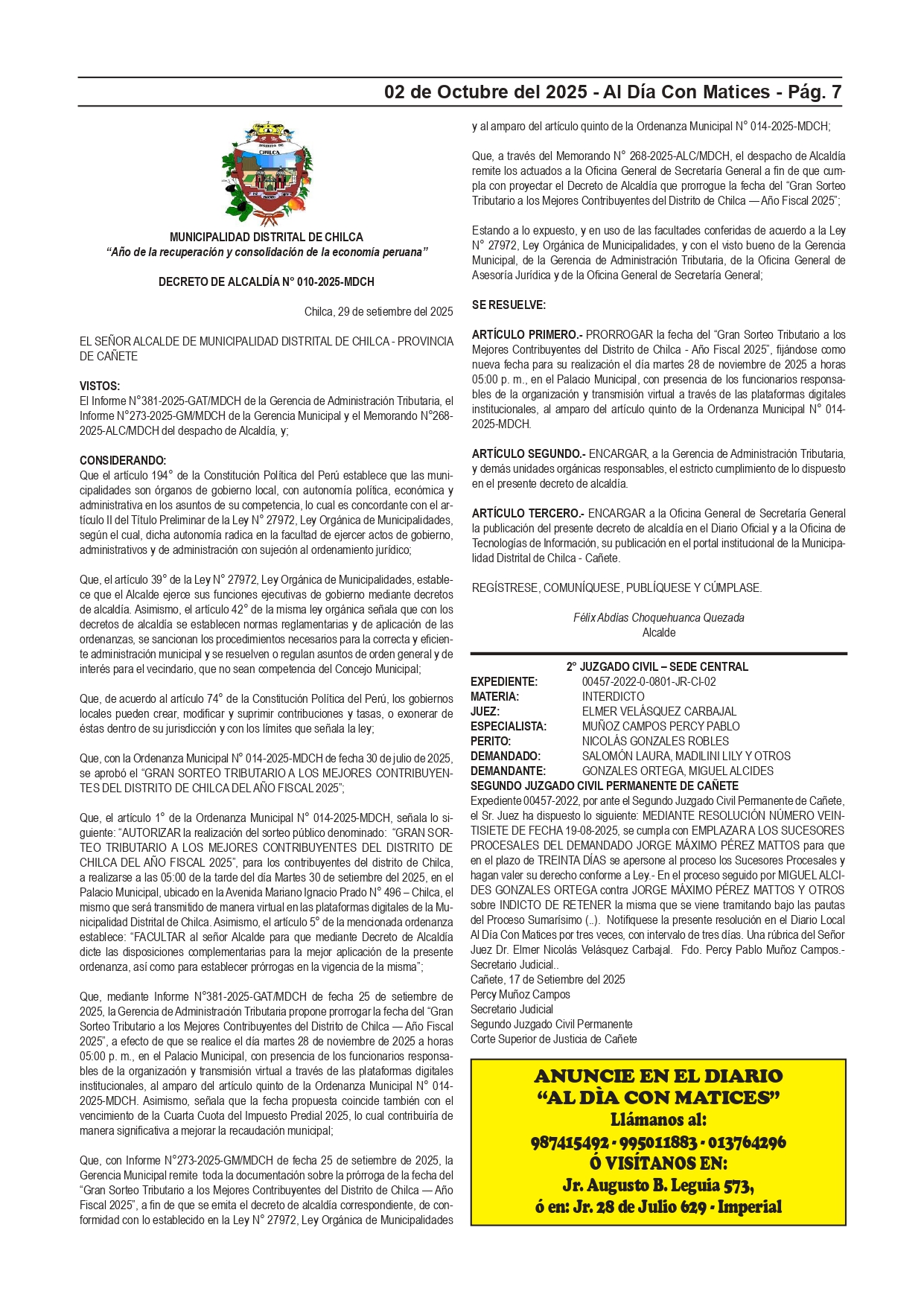 DECRETO DE ALCALDÍA N° 010-2025-MDCH