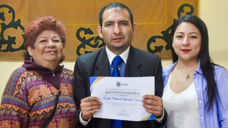 La municipalidad provincial reconoció la importante labor de Fredy en el periodismo cañetano, y en compañía de su madre, Anatolia Casas de Sánchez, y su hermana, recibió un merecido homenaje.