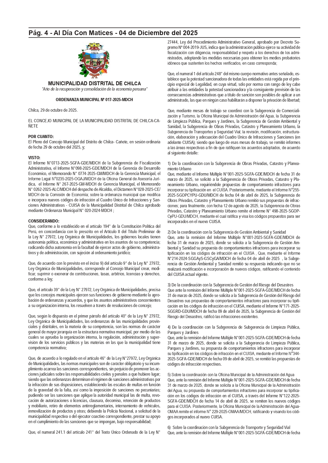 ORDENANZA MUNICIPAL Nº 017-2025-MDCH
