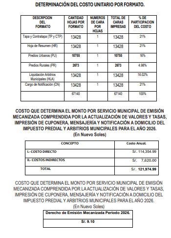 ORDENANZA QUE DETERMINA EL MONTO POR EL SERVICIO MUNICIPAL DE EMISIÓN MECANIZADA COMPRENDIDA POR LA ACTUALIZACIÓN DE VALORES Y TASAS, IMPRESIÓN DE CUPONERA, MENSAJERÍA Y NOTIFICACIÓN A DOMICILIO DEL IMPUESTO PREDIAL Y ARBITRIOS MUNICIPALES PARA EL AÑO FISCAL 2026