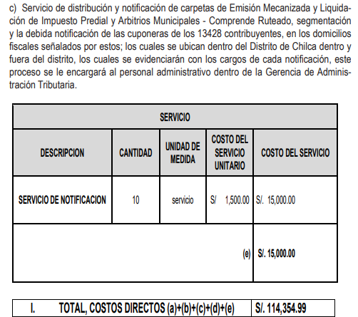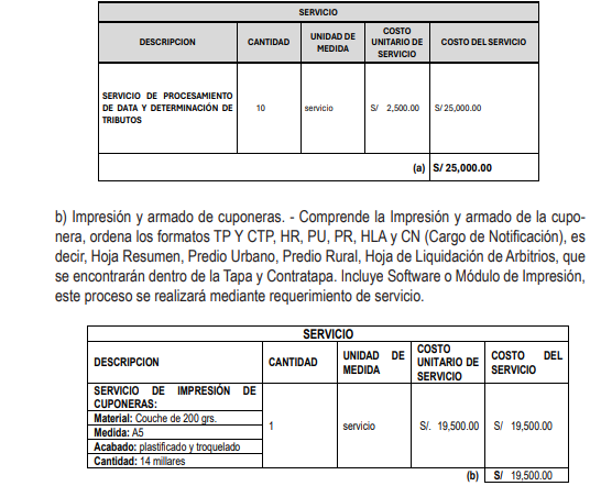 a) Servicio de Procesamiento de Data y Determinación de Tributos para el Ejercicio 2026.- Comprende las actividades necesarias para la determinación de la deuda tributaria de los contribuyentes del distrito de Chilca - Cañete, tales como: Generación de Base de Datos, Registro de Valores arancelarios de los predios, según los planos arancelarios aprobados por el Ministerio de vivienda, Registro de valores unitarios de edificación (categorías constructivas), Registro de valores unitarios de las Obras Complementarias y Otras Instalaciones, Registro del valor de la UIT para el ejercicio fiscal 2026, Registro de fechas de vencimiento, Registro del Impuesto Predial mínimo, Adecuación del sistema con la nueva ordenanza municipal para los arbitrios municipales 2026. Generación de las Declaraciones Juradas de todos los contribuyentes (Hoja de Resumen, Predio Urbano, Predio Rustico, Obras complementarias y otras instalaciones, hoja de liquidación de arbitrios), Determinación del Impuesto Predial y arbitrios municipales, con su respectiva Base Imponible, de cada contribuyente del distrito, Generación de cuenta corriente de la Deuda Tributaria, Elaboración del padrón general de las declaraciones juradas mecanizadas del 2026, Generación de la tasa de Derecho de Emisión Mecanizada, este proceso se le encargará personal administrativo dentro de la Gerencia de Administración Tributaria: