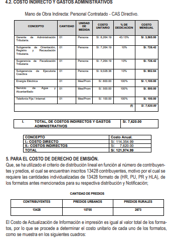 El presente Informe técnico elaborado por la encargada de la Gerencia de Administración Tributaria establece el costo por el Servicio Municipal de Emisión Mecanizada comprendida por la Actualización de Valores y Tasas, Impresión de Cuponera, Mensajería y Notificación a Domicilio del Impuesto Predial y Arbitrios Municipales para el Año 2026, cumpliendo con los requisitos para la exigencia legal del costo por el mencionado servicio, y su elaboración en función a la información actualizada con que cuenta la Municipalidad en su base de datos, por lo que se determina el monto de los tributos, la emisión de recibos de pago y la distribución de los mismos al domicilio fiscal del contribuyente, dentro y fuera del distrito, cumpliendo con los lineamientos técnicos para acotar el costo efectivo que demanda el servicio, tomándose en cuenta los criterios establecidos en el ordenamiento jurídico vigente. Asimismo, el presente Informe Técnico se ha elaborado respondiendo al costo incurrido en la prestación del servicio y que el mismo tiene como sustento técnico y legal su estructura de costos correspondiente que forma parte de la Ordenanza y que garantiza el servicio prestado por esta comuna, en el cual se realizaran las pautas metodología para la determinación de costos del referido servicio, que comprende los costos directos, indirectos y fijos, procedimiento que da origen al costo por derecho de Emisión Mecanizada del valor Tributario, esto es, de la Declaración Jurada del Ejercicio Fiscal 2026. La determinación de los costos por el derecho de emisión mecanizada por el Impuesto Predial y Arbitrios Municipales, correspondiente al ejercicio 2026, está basada en los costos reales que demanda el servicio prestado y en absoluto cumplimiento a lo dispuesto por la cuarta Disposición Final de la Ley de Tributación Municipal, la cual señala que las Municipalidades que brindan el servicio de emisión mecanizada de actualización de valores, determinación de Impuestos y de recibos de pagos correspondientes, incluida su distribución al domicilio fiscal que declara el contribuyente, quedan facultadas a cobrar y recaudar por dichos servicios como máximo hasta el 0.4% de la UIT vigente al primero de enero de cada ejercicio, en base a la estructura de costos que sustenta el costo a cobrar.