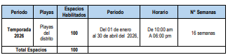 Las zonas de estacionamiento vehicular temporal sujetas al cobro de la Tasa, comprende a los espacios físicos determinados en las playas del distrito de Asia que se indican a continuación y que se han determinado para la temporada 2026: