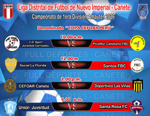 Con 2 grupos se inicia el próximo 15 de Febrero el Torneo de Primera División de la Liga de Nuevo Imperial, Denominado COPA CEFOAR PERU Grupo “A”: Conformado por: Cefoar Perú Centro de Formación de Alto Rendimiento, Estudiantil Señor de Cachuy, CD Sport Juventud Carrizales, Club Deportivo Picaflor Cañetano F.B.C y el Club deportivo las viñas Grupo “B”: Conformado por: Club Sport Deni, Social La Florida, Santa Rosa FC, Santos FBC y el Unión Juventud Nuevo Imperial. Aquí la programación: