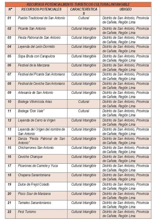 ARTÍCULO PRIMERO. – DECLARAR DE INTERÉS PÚBLICO LOS RECURSOS POTENCIALMENTE TURÍSTICOS DEL DISTRITO DE SAN ANTONIO, de origen cultural e intangible según detalle adjunto que forma parte del presente: