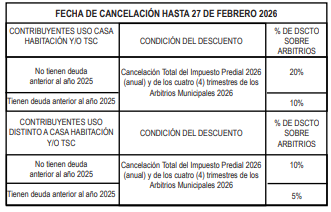 Establecer las fechas de vencimiento para el pago de Impuesto Predial, y Arbitrios Municipales del Ejercicio Fiscal 2026; aí como el régimen de incentivos por el pronto pago de Arbitrios Municipales, de acuerdo al siguiente cronograma: