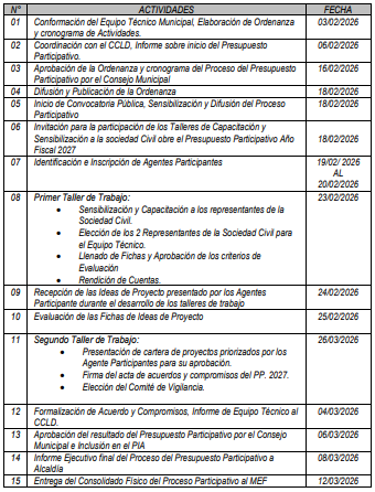 CRONOGRAMA DE ACTIVIDADES DEL PROCESO DEL PRESUPUESTO PARTICIPATIVO AÑO FISCAL 2027