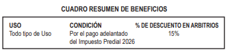 4.2 Los contribuyentes propietarios, poseedores y/o responsables solidarios de predios de usos distintos a casa habitación, que opten por el pago anual adelantado del impuesto predial (cuatro cuotas) y arbitrios municipales (doce cuotas) del ejercicio fiscal 2026, hasta la fecha de vencimiento del pago de la primera cuota del impuesto predial de dicho ejercicio, obtendrán descuento contra los montos insolutos anuales de los arbitrios municipales del ejercicio fiscal 2026, según el cuadro resumen de beneficios. Se cumple con la condición del pago anual adelantado para el caso de los arbitrios municipales cancelando la totalidad de estos en cada anexo y/o predio independientemente del hecho que pueda existir otros anexos o predios por cancelar.
